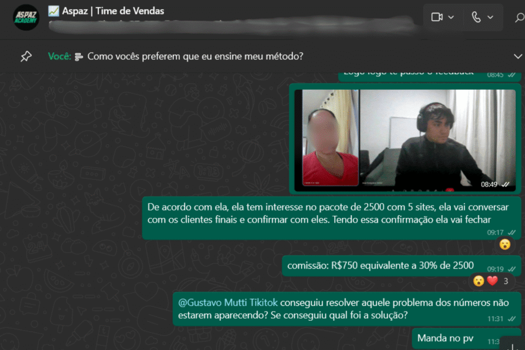 Lá dentro, eu tiro dúvidas todos os dias, dou dicas práticas e acompanho cada passo da sua jornada. É nesse grupo que a galera aprende a fechar vendas como essa aqui do print — R$2.500 vendidos, R$750 de comissão direto no bolso. A regra é simples: se você vender, você ganha. E se tiver dúvida, pergunta no grupo. A resposta vem.